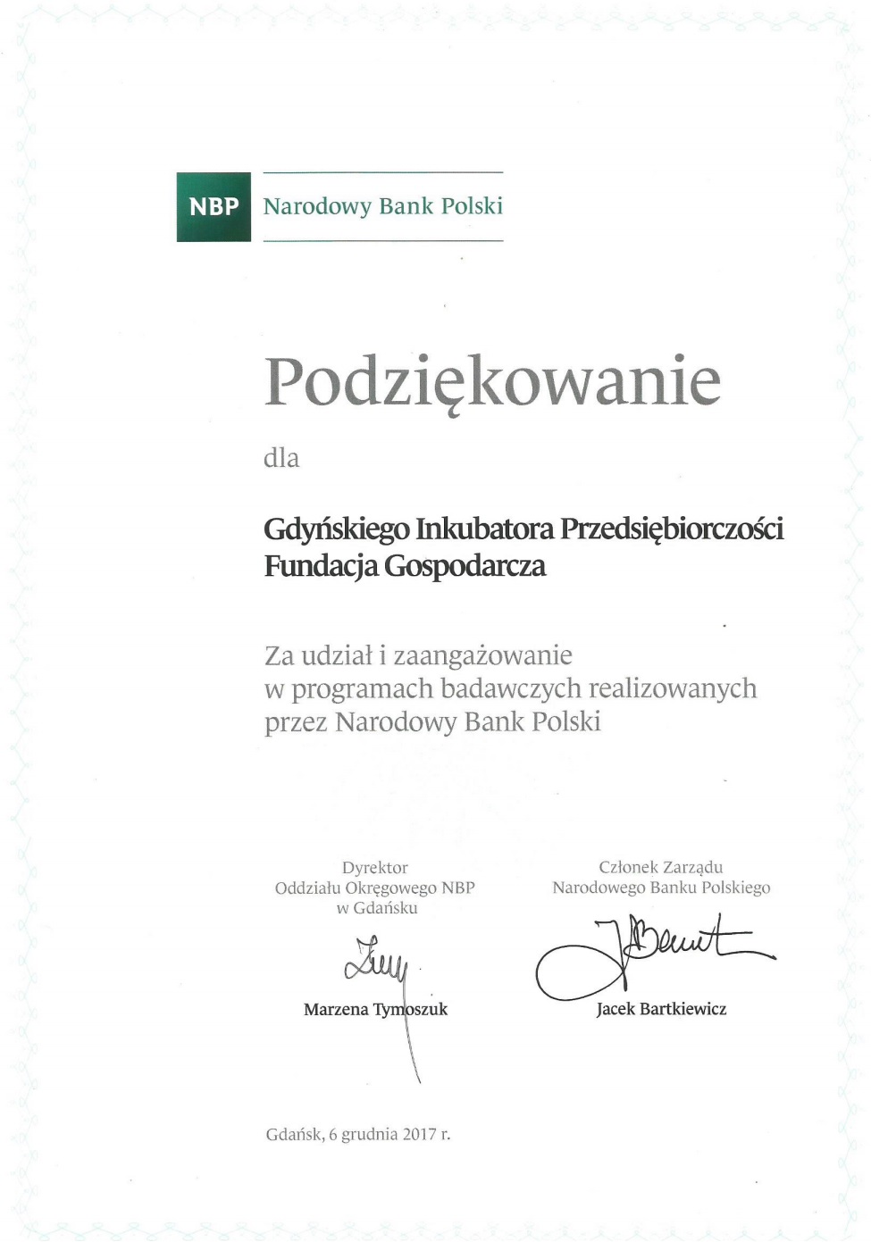 Podziękowanie Narodowego Banku Polskiego